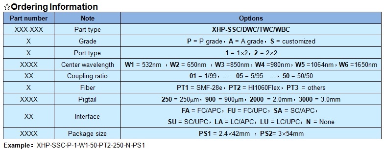 XHP 1×2 special fiber coupler features low insert loss, high return loss, low PDL, stable and reliable. It can be integrated into fiber communication network, fiber sense system, and fiber test equipment etc.