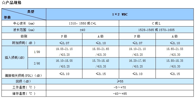 讯鸿(XHP)生产的1/99 1550WBC单模光纤耦合器(XHP-FBT1/99)插入损耗低,回损高,PDL小,稳定可靠。适用于光纤放大器、光纤传感系统和光纤测试设备。