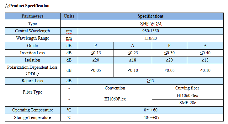 The 980/1550 single mode fiber wavelength division multiplexer(XHP-WDM980/1550), produced by XHP ,features low insertion loss, high return loss, low PDL, as well as stable and reliable performance. It is suitable for fiber communication network, fiber amplifier, fiber laser,fiber sensing system , fiber test equipment , etc.