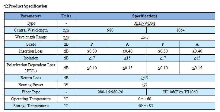 The 980/1064 single mode fiber wavelength division multiplexer(XHP-WDM980/1064), produced by XHP ,features low insertion loss, high return loss, low PDL, as well as stable and reliable performance. It is suitable for fiber amplifier, fiber laser , fiber test equipment , etc.